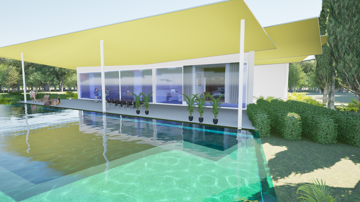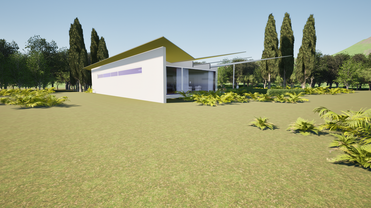 modern, light, and strongly connected to the landscape.the folded roof surfaces are striking. they are reminiscent of cantilevered wings or blades and lend the building a dynamic, almost sculptural effect. the building itself is rather low and horizontally organized. white, clean wall surfaces create a calm contrast to the expressive roof.large expanses of glass open the building up to the outside. this creates a close connection between the interior and the garden, and the building appears transparent and inviting.overall, the building conveys a pavilion-like character – open, flooded with light.